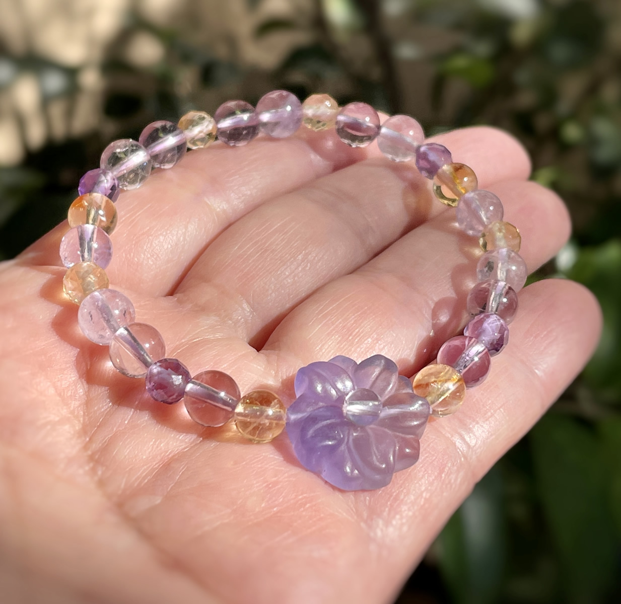 ブレスレット アメジストシトリンデザインフローライト紫花 優しい紫、バイカラーお花フローライト、アメジスト、シトリンのデザインブレスレット 2023.04.262025.07.22 meme フローライトのお花をポイントに水晶、アメジスト、シトリンで仕上げた健康、ヒーリング、ストレス緩和を願うブレスレットです。 淡い色合いのお花はバイカラーになっています。 バイカラーフローライトお花 フローライトお花デザイン 健康、ヒーリング